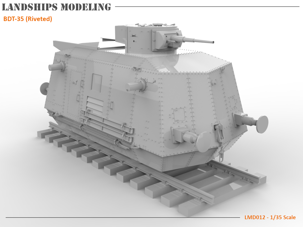 The riveted version of an interwar Soviet self propelled armored railcar. 82 total parts build up into a unique model over 8" long, 3.25" wide and 4.25" tall. Outside flange to outside flange spacing on the railroad wheels is 43mm, accurately representing Russian rail gauge in 1/35.