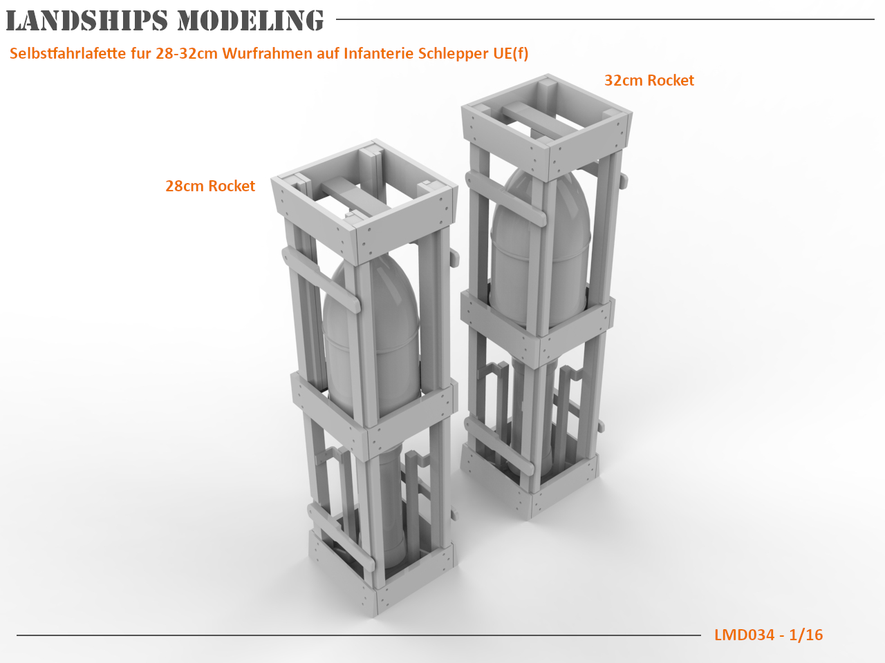 Once captured by the Germans, many of the French UE vehicles were converted to various roles, 40 of which were modified as mobile rocket artillery. Even within this role there were many versions, with different mounting styles, frames and other details. Using one of the few clear photos, combined with assorted blueprints and line drawings, I have created this Selbstfahrlafette fur 28-32cm Wurfrahmen auf Infanterie Schlepper UE(f) used by the 21st Panzer Division. Renders show the vehicle with 28cm rockets, but 32cm rockets and cases also come with the model.